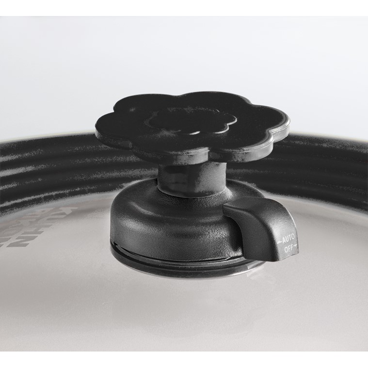 Am Deckelgriff ist ein Ventil angebracht, mit dem Sie zwei Funktionen einstellen können. „Automatik“ und „Off“. Stellen Sie das Ventil auf „Automatik“, öffnet sich das Ventil bei ca. 90°C selbst und der Wasserdampf kann entweichen. So erhalten Sie trotz Deckel ein knuspriges Bratergebnis ohne Spritzer. Ist das Ventil auf „Off“ eingestellt, bleibt der Wasserdampf drin und Sie können kochen und dünsten. Da der Deckelrand Rillen hat, können Sie diesen für verschiedene Pfannen- und Topfgrößen verwenden.