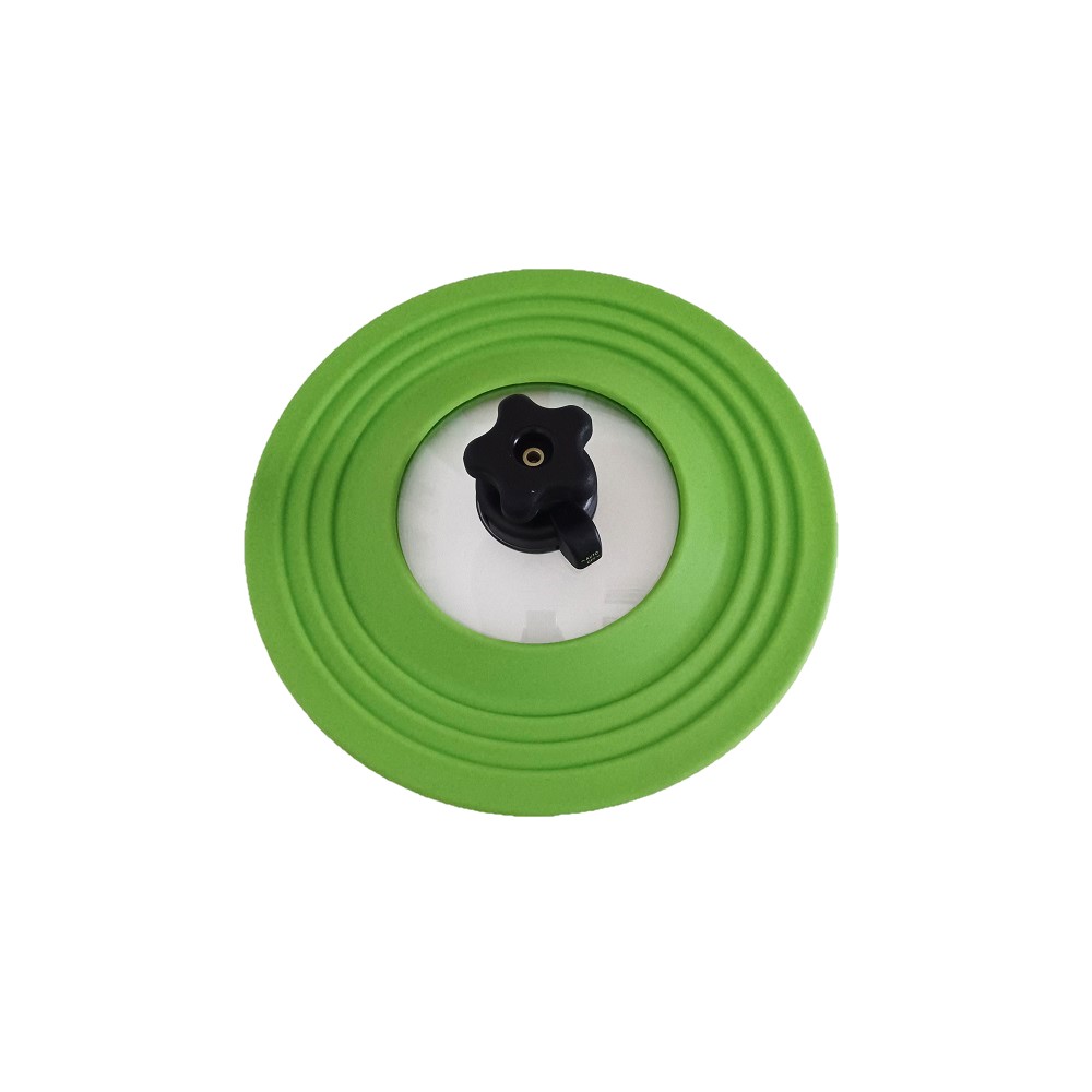 Warnhinweise und Sicherheitsinformationen: Am Deckelgriff ist ein Ventil angebracht, mit dem Sie zwei Funktionen einstellen können. „Automatik“ und „Off“. Stellen Sie das Ventil auf „Automatik“, öffnet sich das Ventil bei ca. 95 °C selbst und der Wasserdampf kann entweichen. So erhalten Sie trotz Deckel ein knuspriges Bratergebnis ohne Spritzer. Ist das Ventil auf „Off“ eingestellt, bleibt der Wasserdampf drin und Sie können kochen und dünsten. Da der Deckelrand Rillen hat, können Sie diesen für verschiedene Pfannen- und Topfgrößen verwenden. Zum Anheben verwenden Sie den Deckelknopf, um den Kontakt mit dem heißen Wasserdampf und somit Verbrennungen zu vermeiden. Mit Wasser und mildem Spülmittel reinigen. Der Deckel ist spülmaschinenfest. Das Ventil bzw. den Griff nicht zu fest anziehen, da der Deckel bzw. das Ventil brechen könnte.